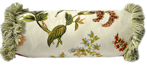 acccent pillow; ivory with multi color floral, frayed trim on ends