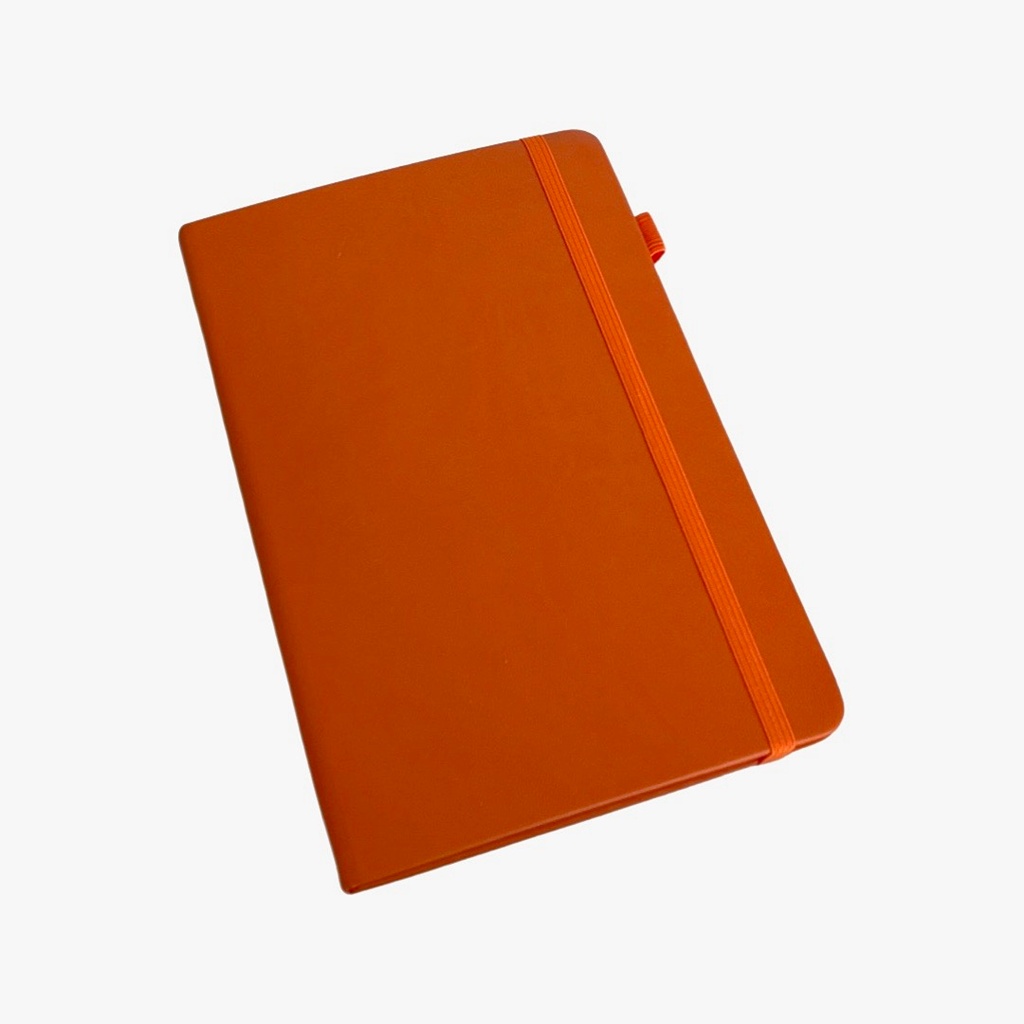 Orange; faux leather; elastic closure and pen holder; lined