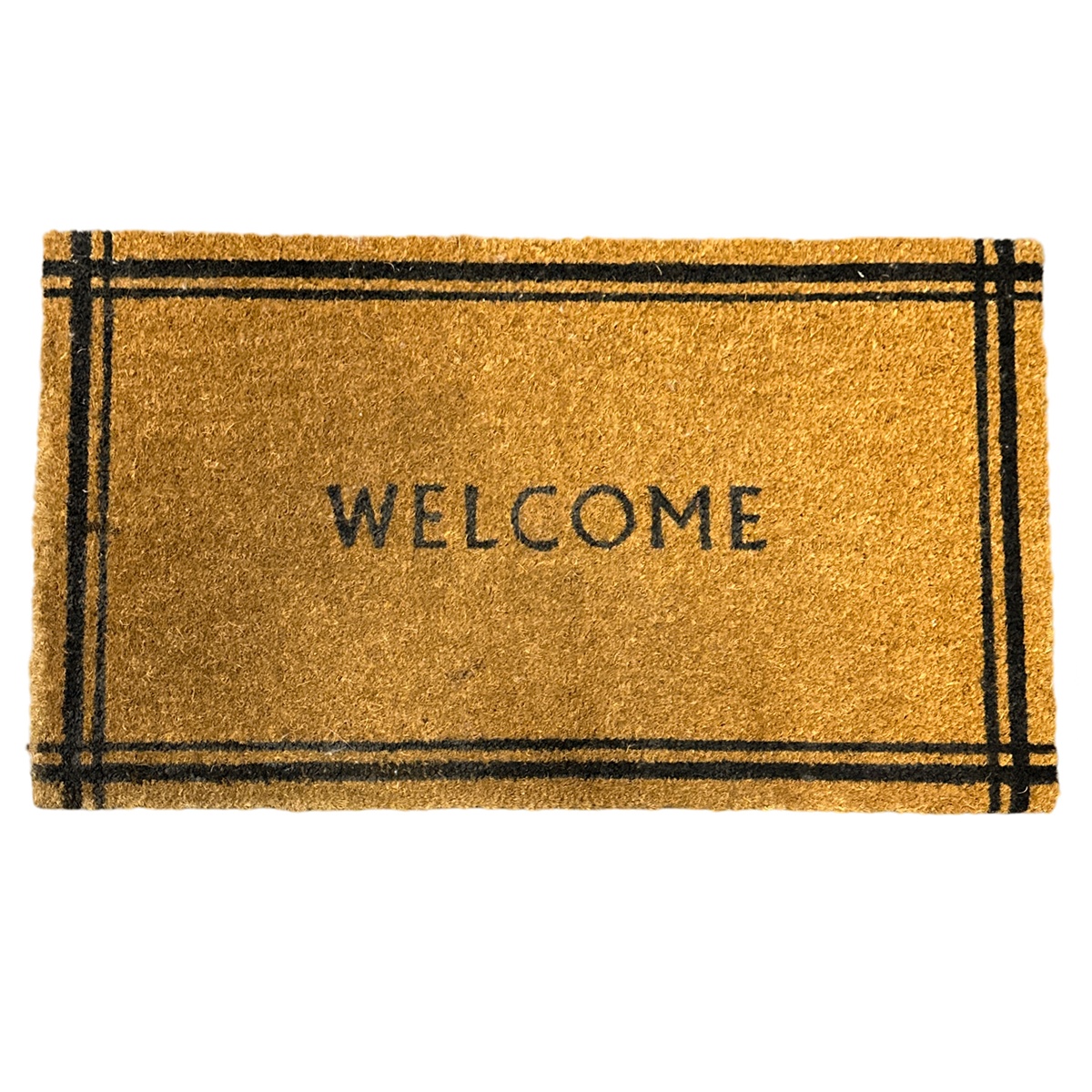 Brown fiber door mat with black border, "Welcome" in the center of the doormat, all caps and black lettering, black rubber bottom