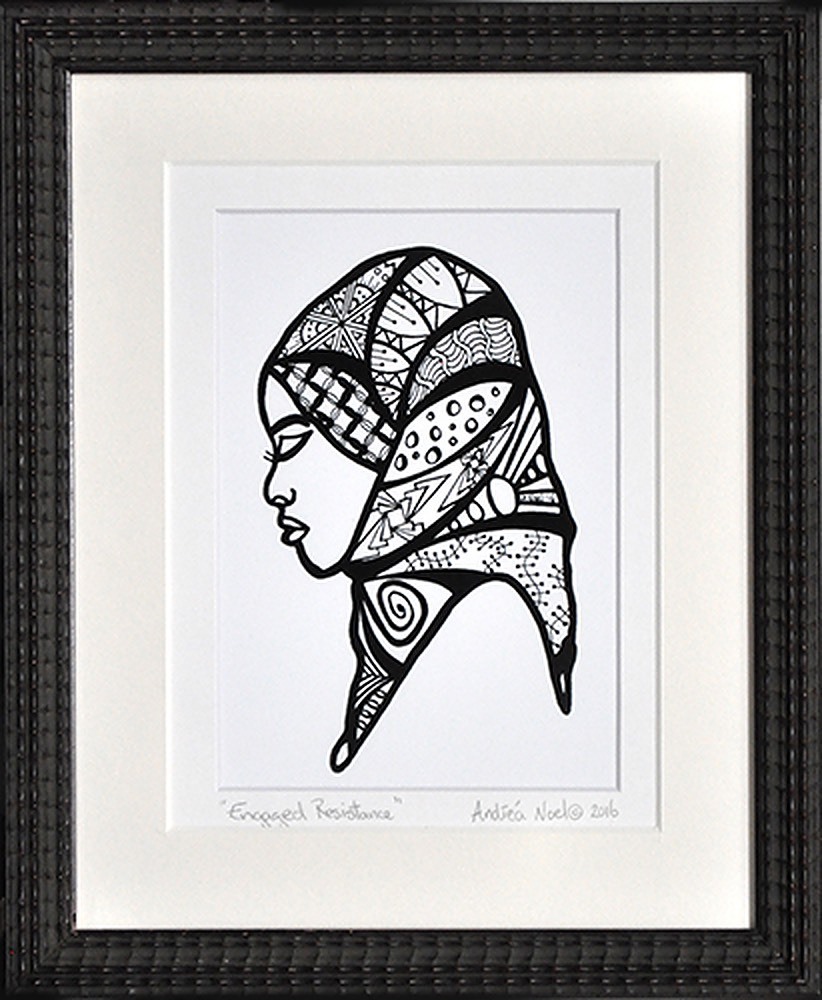 Engaged Resistance, black on white drawing of double window mat, patterned dark brown wood frame, plexiglass