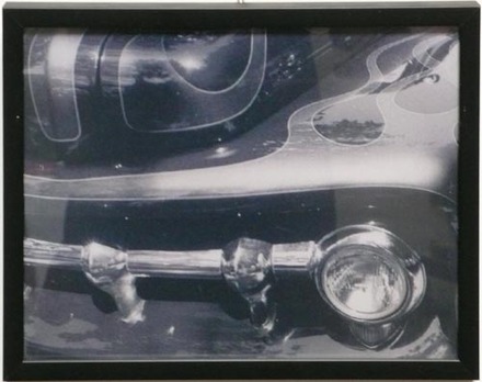 Black frame. Exterior shot of headlight. Frame detail on paint job.