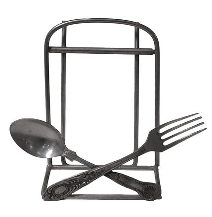 easel: cookbook stand, steel with crossed vintage flatware in front