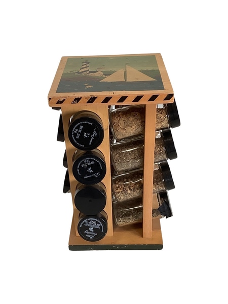 Spice Rack; light wood stain with 15 spice bottles in rotating,