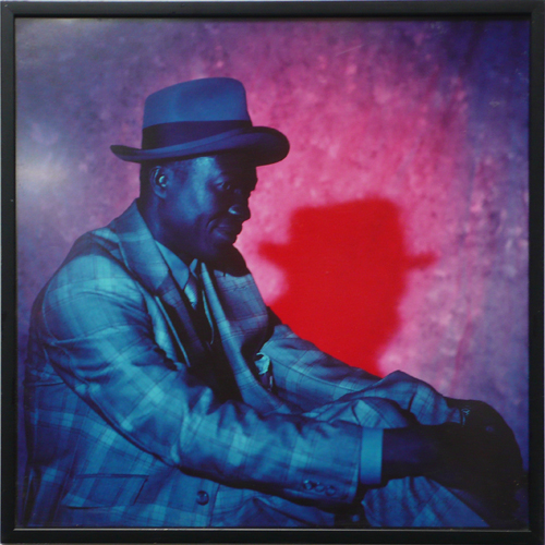 Black frame. Man in plaid suit and fedora. Sitting in front of pink and purple gradient background. Shadow on wall.