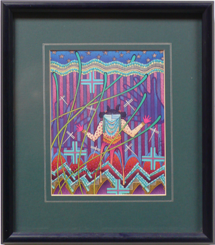Rounded black frame with green mat. Man in printed clothing. Pink and purple stripes behind him. Varying prints throughout.