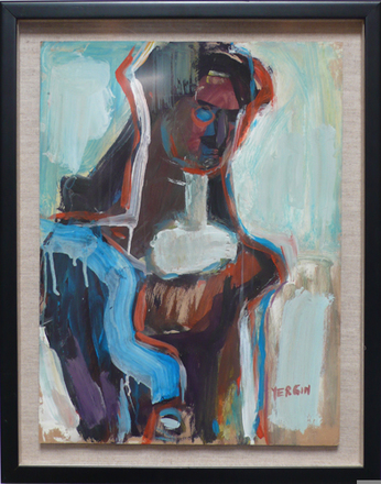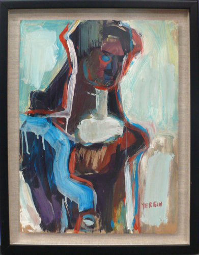 Black frame with off-white mat. Blues, reds, and white painted shapes to make a standing figure with a red face.