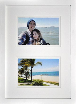 White wooden frame with white mat. Top photo is couple smiling together in front of water. Bottom photo is palm trees next to water and sand...