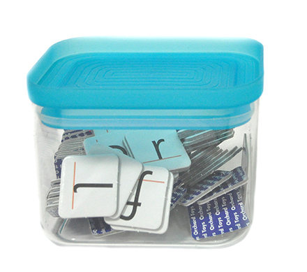 toy; CLEARED, match & spell spelling game pieces, in clear canister, turquoise lid