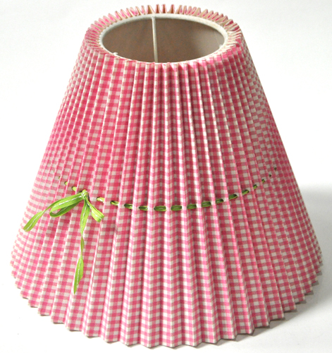 Lampshade, cotton pink checkered, pleated, green ribbon,