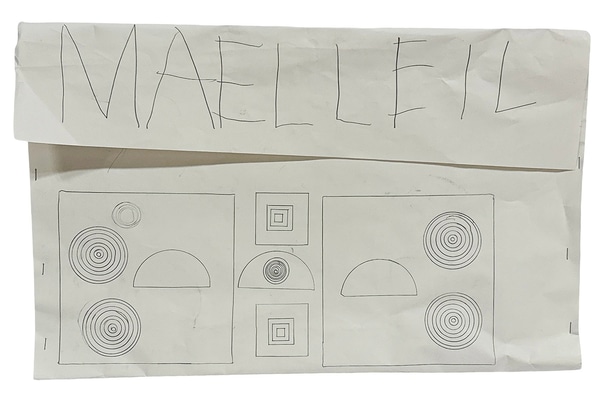 large "envelope" made out of white construction paper stapled together, pencil