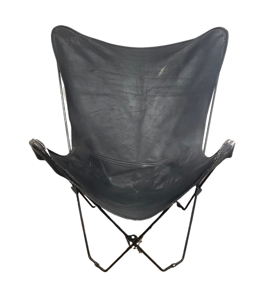 Butterfly Chair; black leather, metal frame,